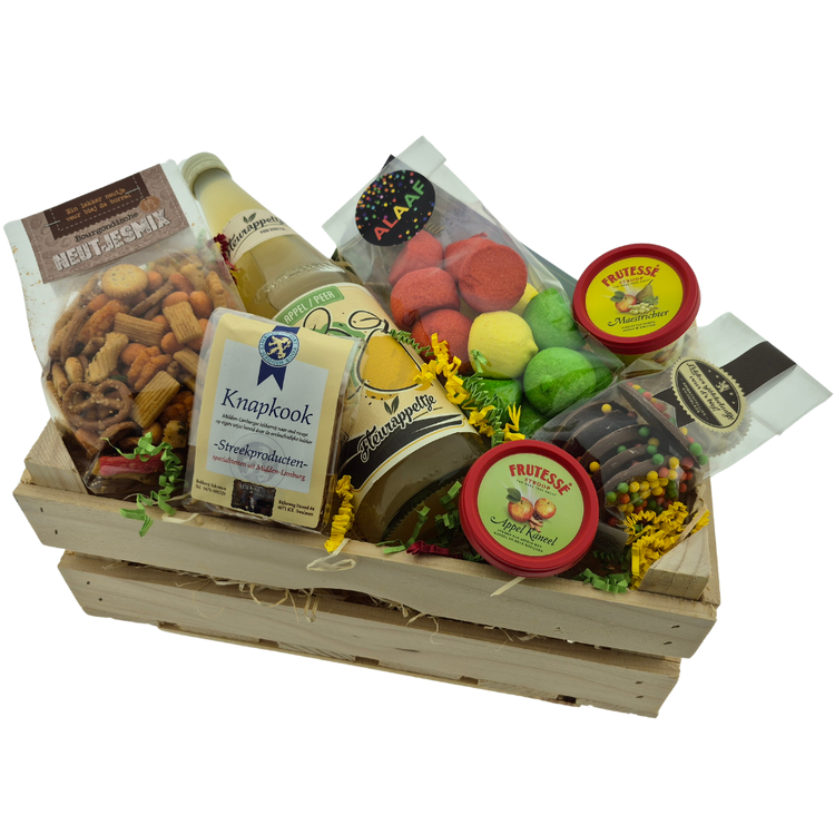 Een mooi robuust houten kistje boordevol echte Limburgse streekproducten voor de echte Carnavalsliefhebbers onder ons. Leuk en lekker om te geven en zeker ook om te krijgen. Dit kistje bevat streekproducten uit allerlei hoeken van onze mooie provincie. Een lekkere mix waar zowel het Vasteloaveshart van vrouwen als ook van mannen sneller van gaat kloppen. Succes verzekerd dus. Bestel dit kistje vandaag nog en verras Prins(ses) Carnaval, de Bachus, het boere broedspaar of een andere hoogheid met een geschenk 'recht uit het hart van Limburg'.