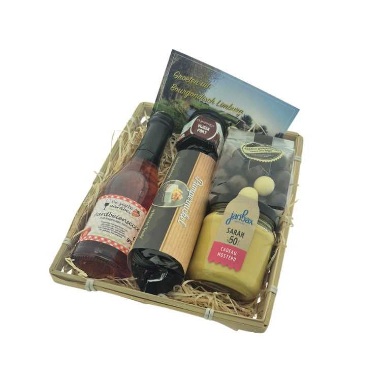 Deze mand wordt afgewerkt met folie en lint zodat u een mooi Limburgs geschenk heeft om cadeau te geven. We kunnen deze streekmand naar ieder willekeurig adres in Nederland, Belgie of Duitsland verzenden. U kunt het Sarah pakket uiteraard ook naar een alternatief verzendadres sturen. Ook kunnen we dan geheel gratis een handgeschreven kaartje met een tekst naar keuze toevoegen. U kunt de tekst invullen, tijdens het bestelproces, onder het kopje extra informatie.