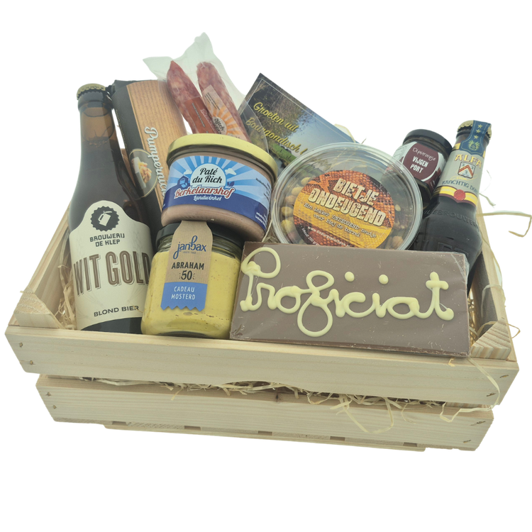 Dit streekpakket Abraham wordt mooi afgewerkt met folie en lint. Zodat u ook een mooi en passend verjaardagsgeschenk kunt aanbieden. We verzenden het pakket volledig veilig ingepakt in een (om)doos binnen 1 tot 2 werkdagen naar ieder willekeurig adres in Nederland, Duitsland of België.