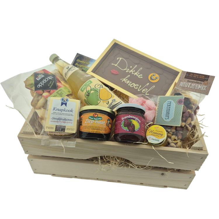 Dit mooie streekpakket dikke knoevel zit boordevol heerlijke streekproducten. Een echte oppepper recht uit het hart van Limburg. Wie gaat u verrassen met dit gevarieerde pakket. Een lekkere opkikker die gegarandeerd bij de ontvanger in de smaak zal gaan vallen.