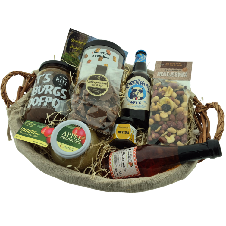 Het Lekker Zuid-Limburg groot pakket is een luxe mix van streekproducten uit Zuid-Limburg. Verpakt in een robuuste rieten mand. Een mooi en origineel pakket om te geven en zeker ook om te krijgen. Wie gaat u verrassen met dit lekker Zuid-Limburg groot pakket?