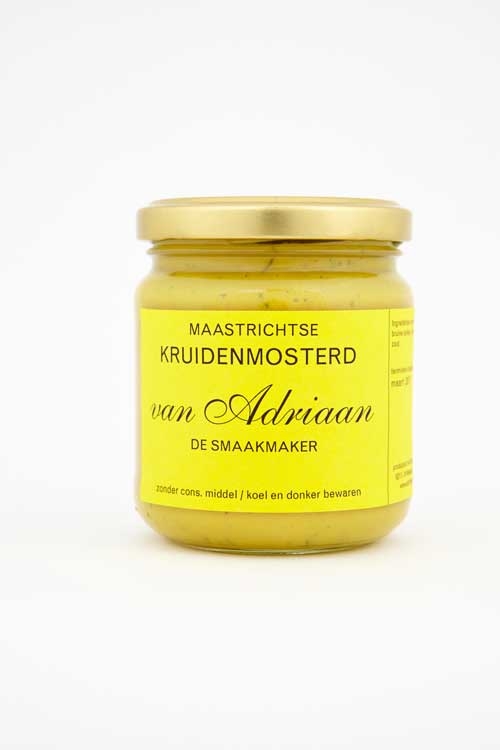 Deze kruiden mosterd wordt ambachtelijk geproduceerd bij Adriaan de smaakmaker in Maastricht.